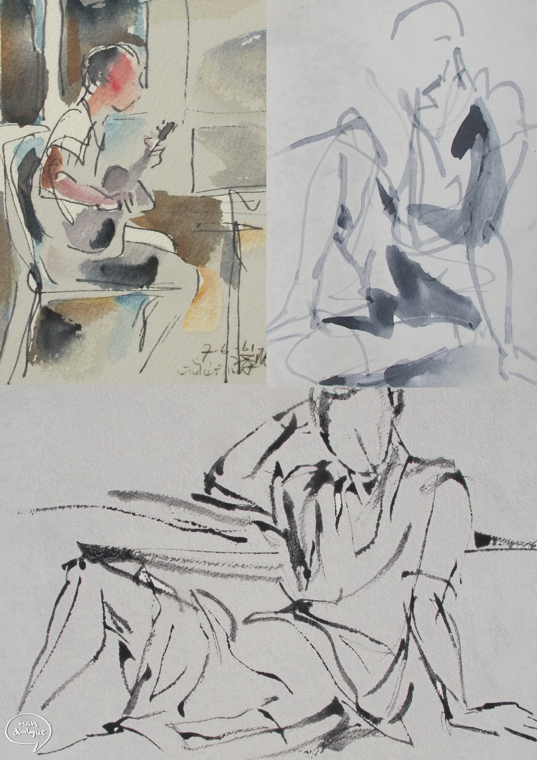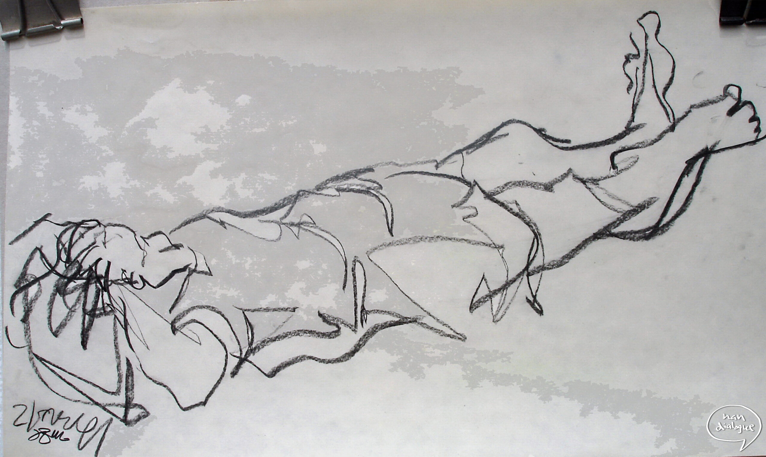 ชั่วโมงหนาวๆ นี้ ที่โบซาร์ไม่ใช่นู้ดครึ่งตัว เขาให้เขียน Figure Nude แบบ Contour Drawing เด็กสาวสามคนคงต้องทนหนาวอยู่บ้าง แม้จะมีเครื่องทำความร้อนอยู่ในห้องโถงนั้น ห้องยาวราว 6×8 เมตร แบบกะด้วยสายตา นักศึกษาชาวสิงคโปร์พาเราไป ที่ตึกเรียนเขามีพื้นที่เป็นเหมือนสตูดิโอขนาดย่อม ให้นักศึกษามีที่ทำงานส่วนตัวแบบที่ตึกอาร์ตของจุฬาลงกรณ์มหาวิทยาลัยก็มี